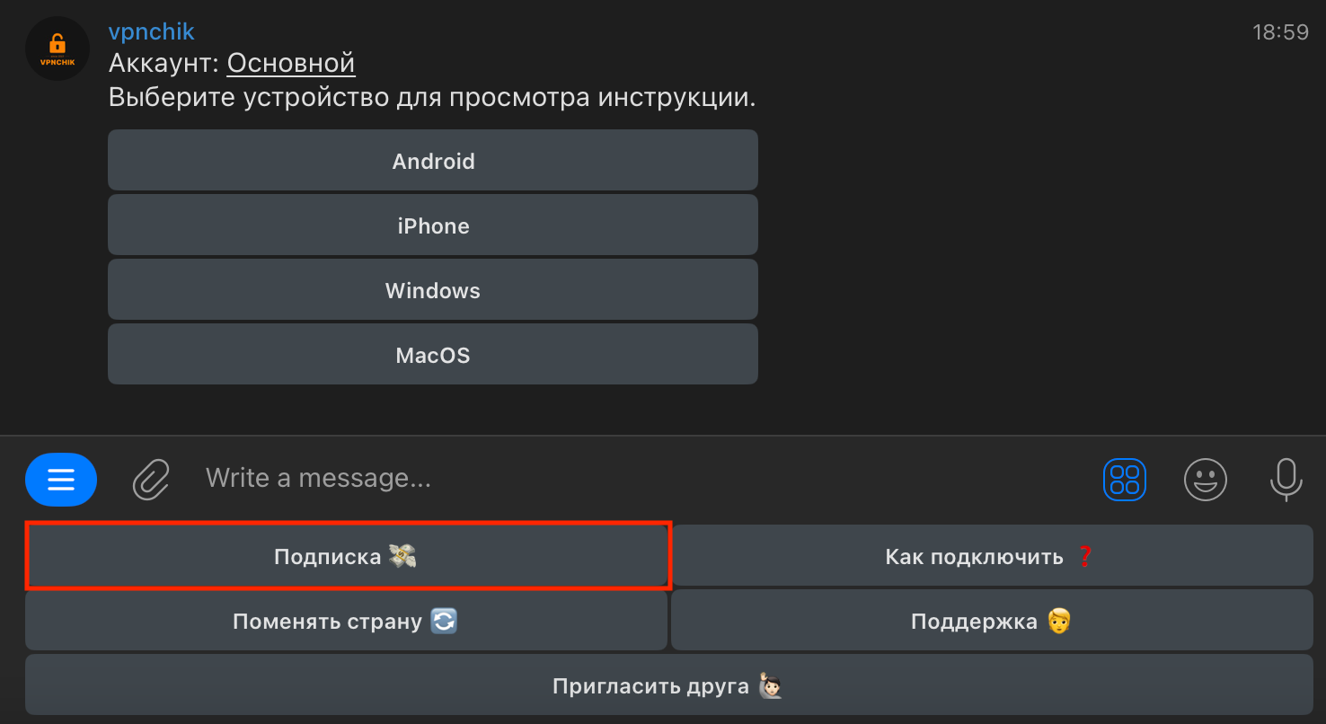 - Ключи, которые принадлежат одному аккаунту, можно использовать только на одном устройстве одновременно. При этом вы можете использовать ключи от одного аккаунта на нескольких устройствах, но при включении Vpnchik на устройстве А, необходимо выключить Vpnchik на устройстве B.