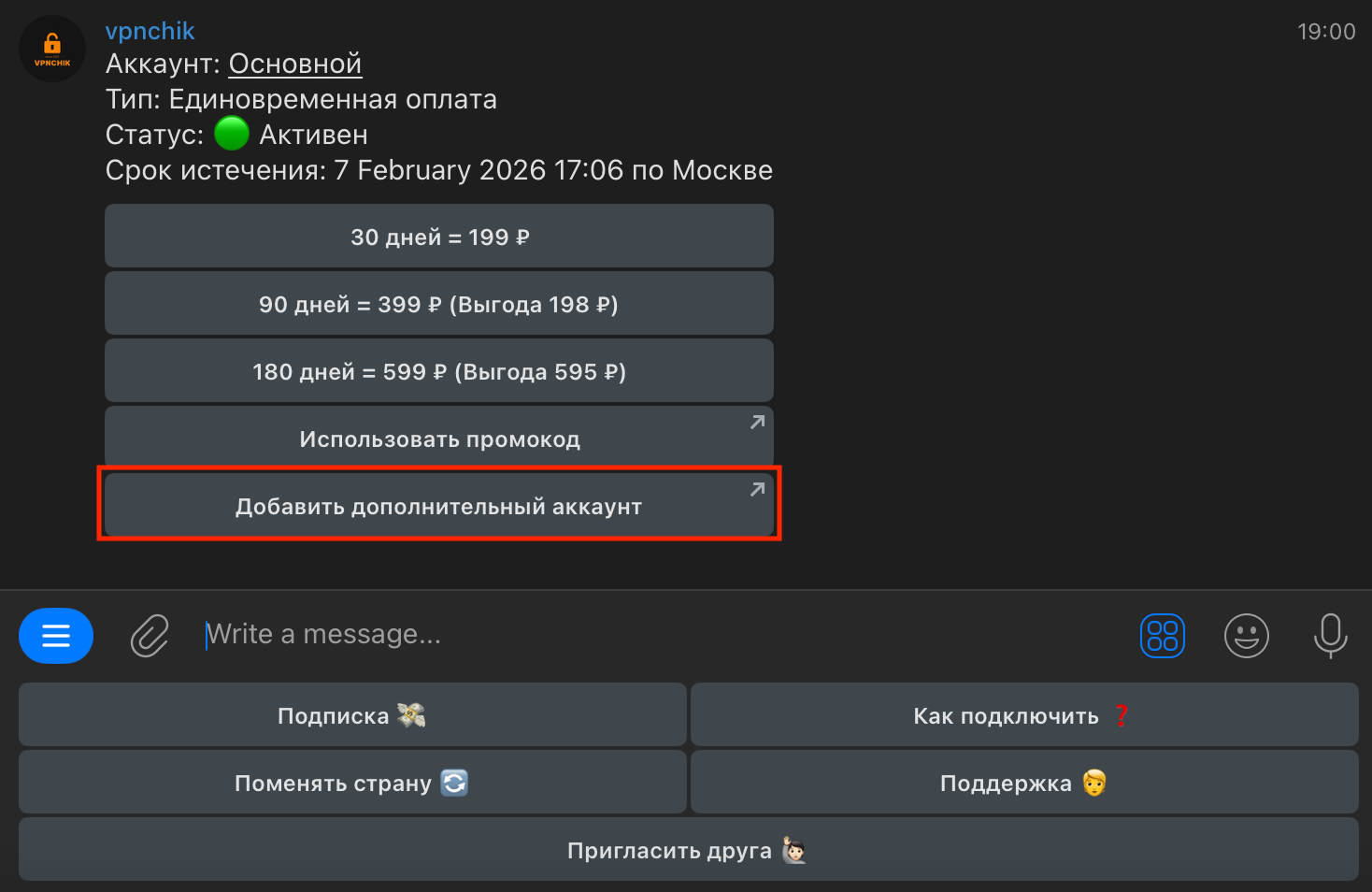 2. Бот пришлет блок из кнопок. Нажмите на кнопку «Добавить дополнительный аккаунт»