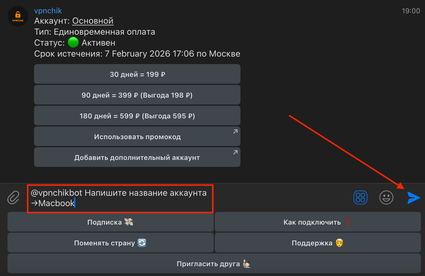 3. Бот пригласит вас ввести имя для аккаунта. Придумайте название для нового аккаунта, и отправьте боту сообщение.