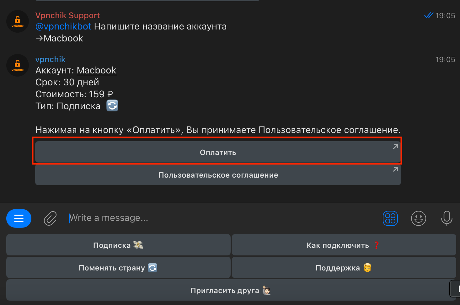 5. Бот пришлет вам кнопки для оплаты. Перейдите по кнопке и совершите оплату.