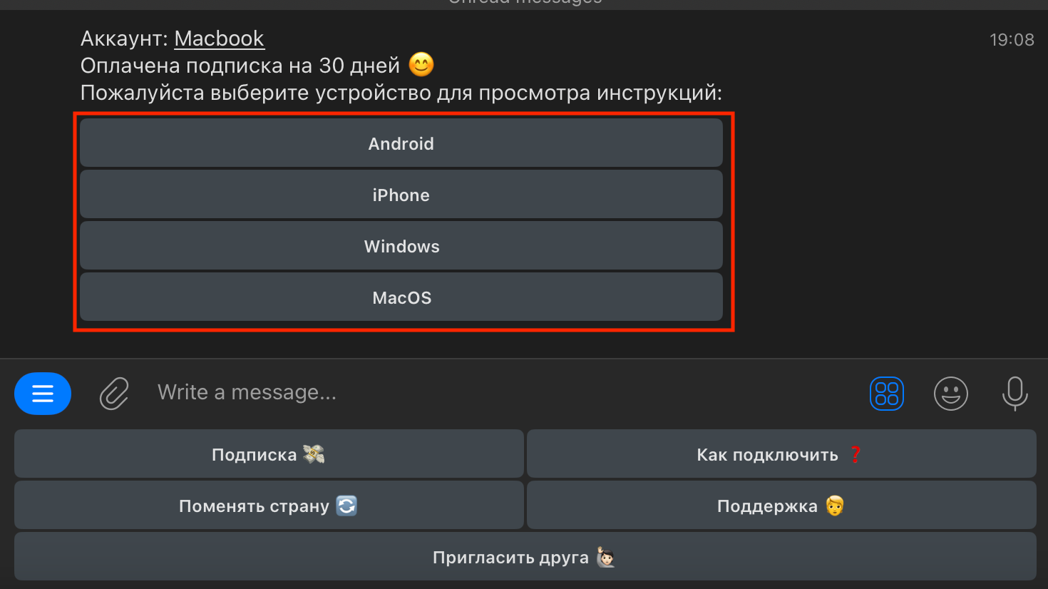 6. После оплаты, бот пришлет вам уведомление об успешной оплате и кнопки, нажав на которые, можно получить новые ключи и инструкции.