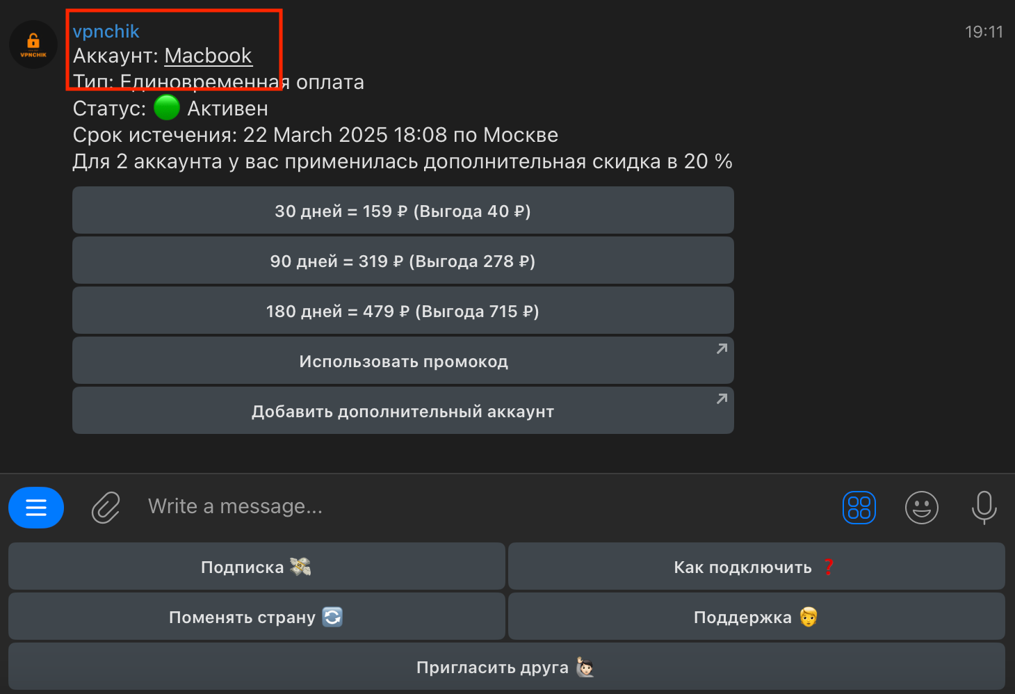 7. Обатите внимание, что теперь при нажатии кнопок в боте, появляется название аккаунта. Это нужно, чтобы вам было проще понять, к какому аккаунту относятся данные кнопки.